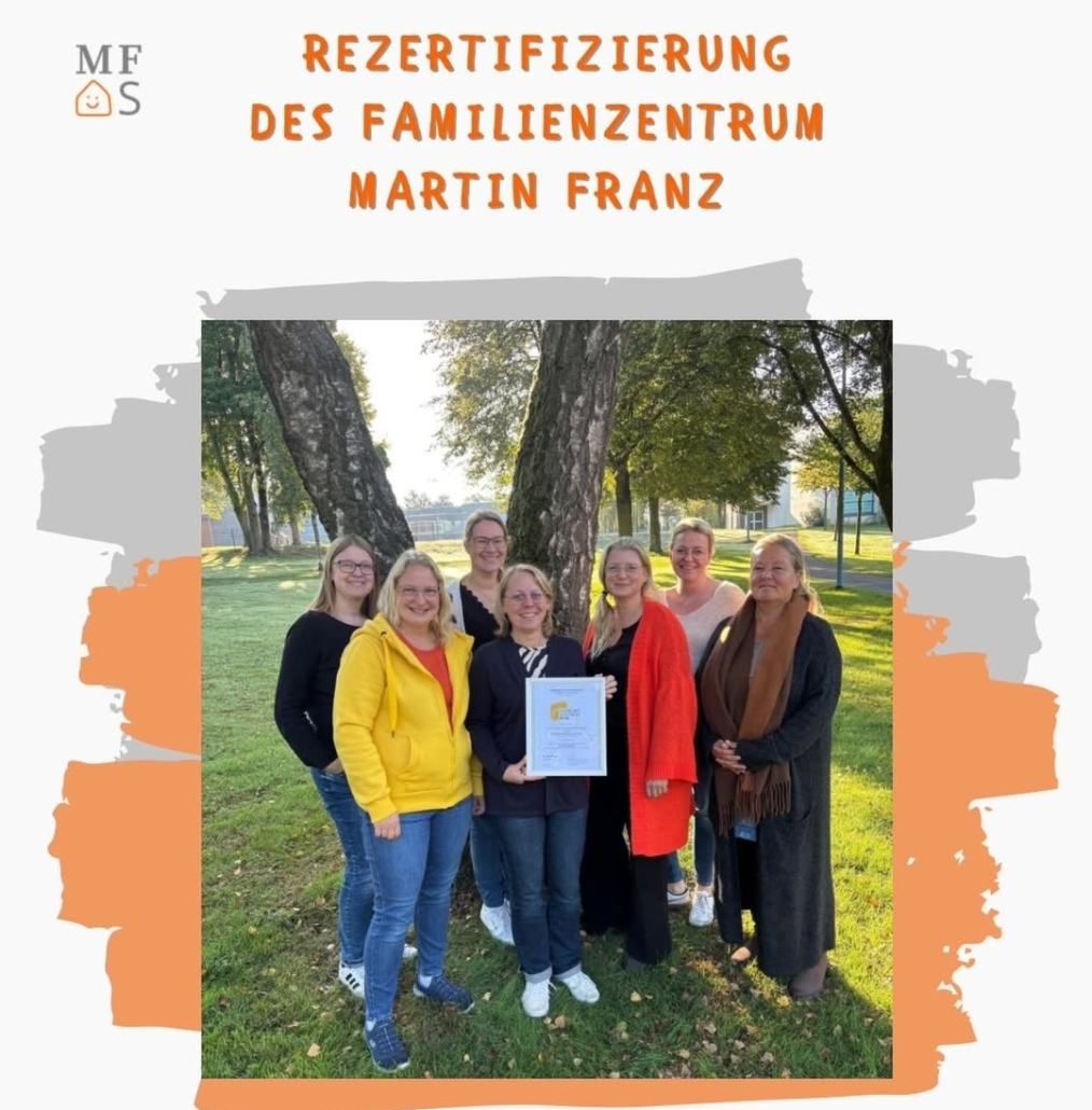 Wir freuen uns sehr, dass unser Familienzentrum erneut erfolgreich re-zertifiziert wurde. Diese Re-Zertifizierung bestätigt die kontinuierlich hohe Qualität unserer Arbeit sowie unser dauerhaftes Engagement für Familien, Kinder und alle Generationen.